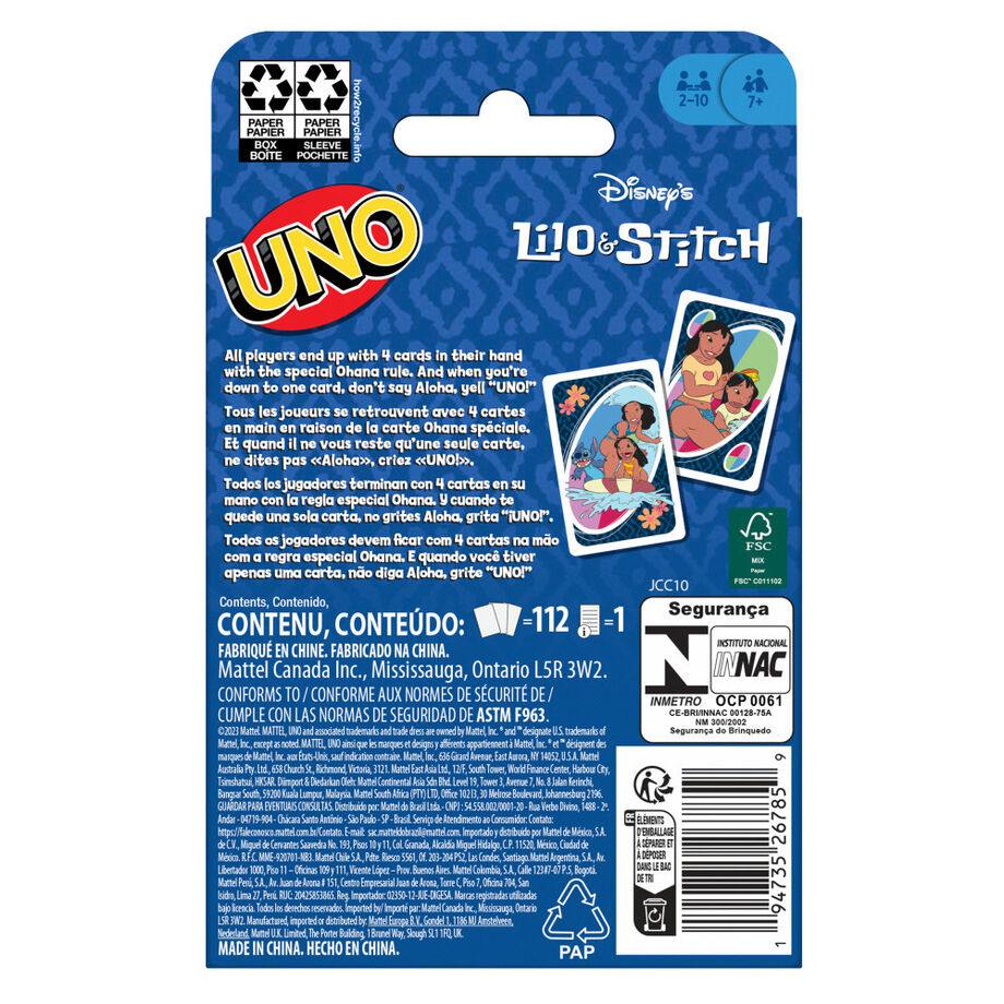 Fans of Disneys Lilo and Stitch will love playing with this UNO themed card game. Players will enjoy this colour and number matching game with a deck of cards featuring artwork inspired by the characters and popular scenes from the film. Theres even a special Ohana rule to eliminate all players with four cards. And dont forget to shout UNO! when you are down to one card. This is an ideal gift for fans of Disneys Lilo and Stitch and card game lovers aged 7 and up. Colours and decoration may vary.